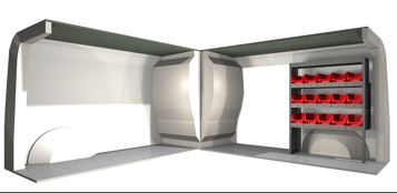 Liukuovesta taakse ulottuva hyllyratkaisu laatikostoin oikealle puolelle tavaratilaa, L1-korimalli. Käännettävissä 5-ovisiin autoihin vasemmalle puolelle. Valmistaja System Edström.